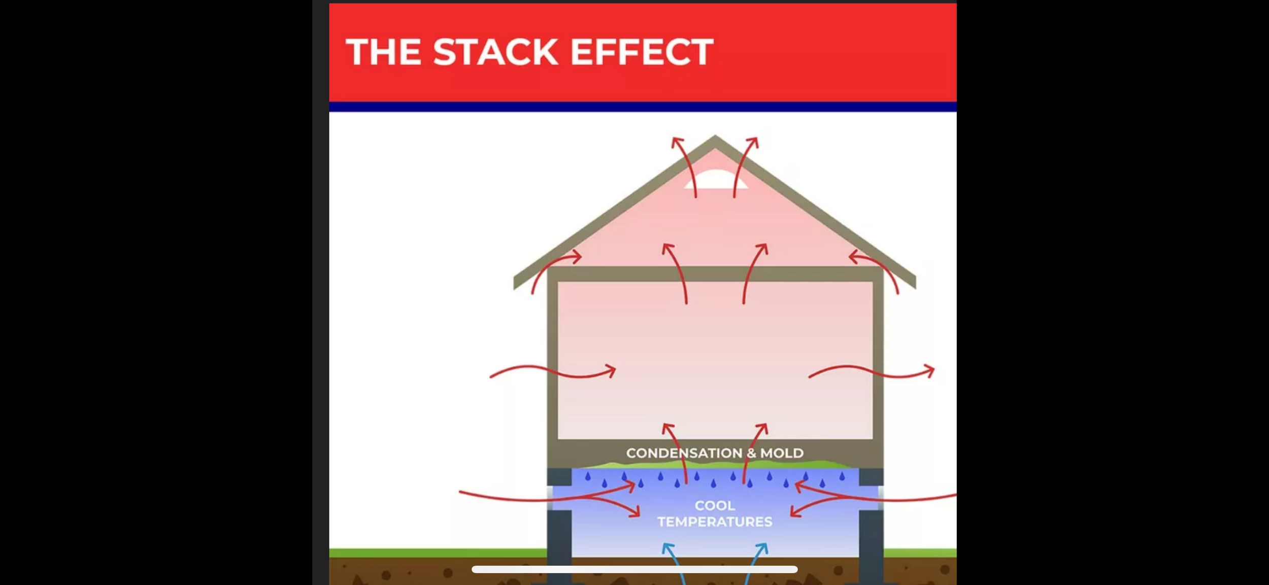 Warm air naturally rises in a home exiting through the attic’s roof vents. This upward movement of air creates a vacuum known as the “stack effect” on the lowest level slab or crawlspace pulling in water vapor and potentially harmful soil gases.